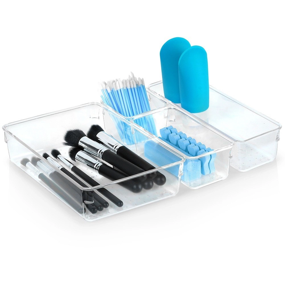 Kies voor een acryl organizer voor cosmetica, een houten of kunstleren sieradendoos, modulaire stapelbare ladeboxen of een textiele lade-organizer. Verstelbare tussenschotten, stapelbaarheid en antislipdetails zorgen voor flexibiliteit, ruimtebesparing en eenvoudig onderhoud. Een kwastenorganizer, lipstickhouder, nagellakorganizer en parfumorganizer houden alles schoon, gescheiden en beschermd tegen stof en beschadigingen. Heb je een oplossing nodig voor de badkamer, je handtas of voor op reis? Een reisorganizer en toilettas met waterafstotende afwerking, rits en vakken zorgen voor veilige opslag van cosmetica, terwijl een 360° draaistandaard en bureau-organizer je dagelijkse make-uproutine versnellen. Meet je lades op, kies de vakindeling en kleur – de juiste cosmetica-organizer bezorgt je elke dag snelheid, overzicht en stijl.