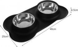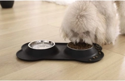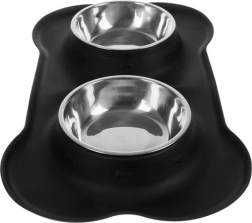Gun je huisdier comfortabel en schoon eten. Twee roestvrijstalen bakjes met een inhoud van 2 × 450 ml zijn geplaatst in een flexibele siliconen onderlegger die gemorst water en uitgestrooid voer opvangt. De botvormige onderlegger heeft een verhoogde rand en een antislip afwerking, zodat hij op zijn plek blijft, zelfs bij enthousiaste eters.