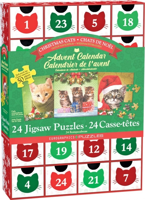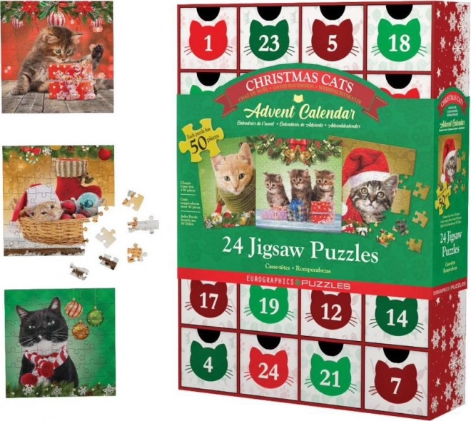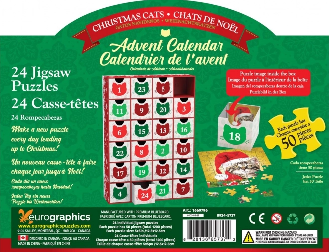 EUROGRAPHICS adventskalender met 24 mini-puzzels Kerstkatten. Elke puzzel 50 stukjes, 12,5 × 12,5 cm. Herbruikbare ladejes met voorbeelden.