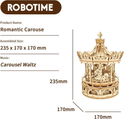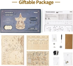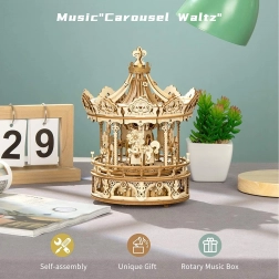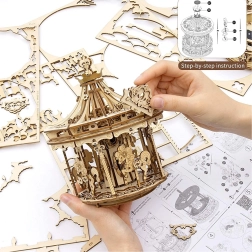 Wanneer u hem in elkaar zet, siert de carrousel uw plank en zal de gedetailleerde afwerking u verrassen. Voor extra plezier tijdens het assembleren, speelt een romantische melodie die u kunt afspelen dankzij een kwalitatieve 18-tonige muziekdoos gemaakt van Japanse componenten.