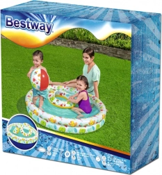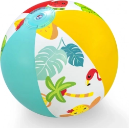 De set bevat een opblaasbaar zwembad, een zwemband en een strandbal – allemaal in een speels tropisch design. Kinderen hebben meteen alles bij de hand voor veilig waterplezier.