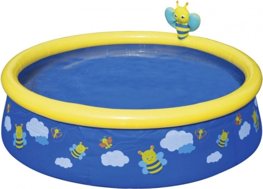 Schattig kinderzwembadje met spreidconstructie en bijenmotief biedt verfrissing en plezier tijdens warme dagen. De geïntegreerde sproeier in bijenvorm sluit je aan op de tuinslang, de opblaasbare rand zorgt voor comfort en stabiliteit en het volume tot 447 l biedt voldoende ruimte voor waterpret.