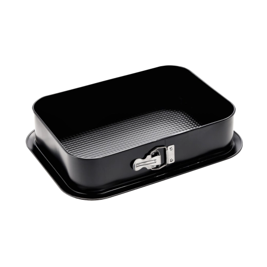 Praktische rechthoekige springvorm met afneembare rand en een anti-aanbaklaag voor het eenvoudig uitnemen van bodems en ongebakken desserts. Zwarte uitvoering, stevig staal en een betrouwbare vergrendelingsmechaniek voor comfortabel bakken in gas- en elektrische ovens.