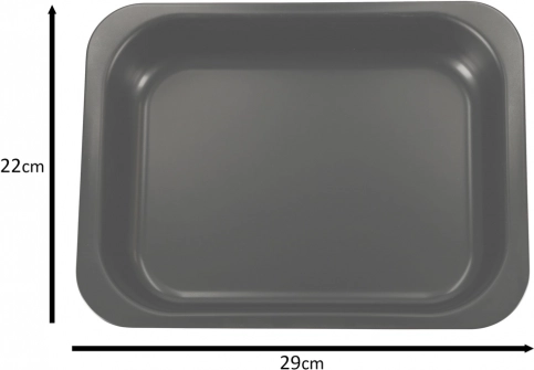 De binnenafmetingen 29 × 22 × 6 cm (buitenmaat ca. 32 × 24 × 6 cm) passen in de meeste ovens en dekken een breed scala aan zoete en hartige recepten.