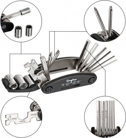 Deze multifunctionele gereedschapsset is de ideale uitrusting voor elke fietser. Dankzij het opvouwbare ontwerp bespaar je ruimte en heb je hem altijd bij de hand – tijdens tochten, op weg naar het werk en bij trainingen. De robuuste afwerking en overzichtelijke opstelling van de tools maken het snel afstellen van remmen, stuur en wielen gemakkelijk.