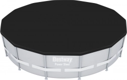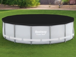 Universeel afdekzeil Bestway voor zwembaden met een diameter van 396 cm, geschikt voor frame- en zelfdragende zwembaden. Beschermt tegen insecten, vogels, bladeren en regen.