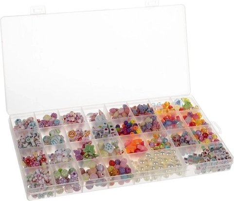 - XXL-set in een organizer - 900 kleurrijke componenten maken het mogelijk om verschillende soorten sieraden te maken. De set bevat ook ringen, touw, sloten en verbindingen.