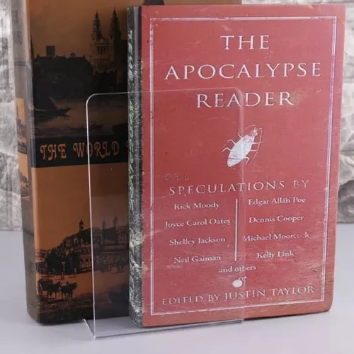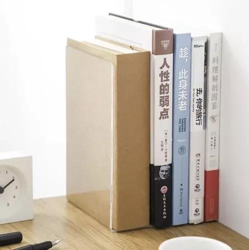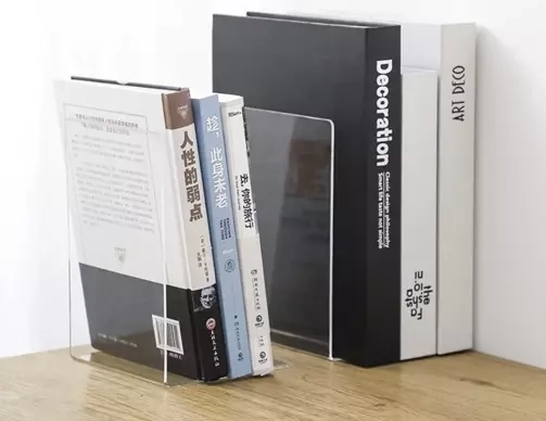 Helder acryl laat de boeken opvallen, oogt strak en verstoort het uiterlijk van de plank of het bureau niet.