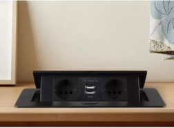 Compacte metalen constructie in het zwart past in moderne interieurs en laat zich naadloos monteren in tafels en werkbladen.