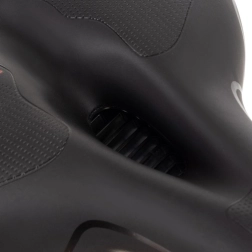 Het ergonomisch gevormde TRIZAND-zadel combineert comfort en duurzaamheid voor stadsritten en langere tochten. Dankzij de zachte schuimlaag en twee stalen veren absorbeert het trillingen effectief, wat vermoeidheid vermindert en het comfort zelfs tijdens langere ritten verhoogt. Het centrale ventilatiekanaal verbetert de luchtcirculatie en beperkt vochtophoping.