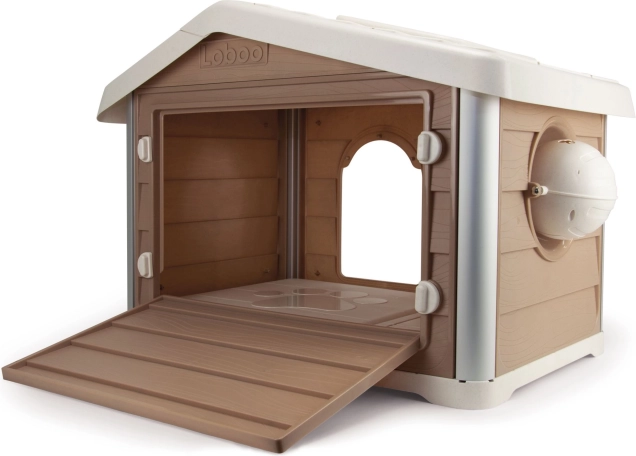 Stijlvol en duurzaam honden- en kattenhuis LOBOO SMARTKAVE ALASKA biedt modulaire constructie, snelle montage zonder gereedschap en uitstekende ventilatie. Dankzij de kantelbare achterwand, het zadeldak met ventilatieraam en de verhoogde binnenvloer met drainagesleuven krijgt je huisdier een comfortabele en veilige schuilplaats, binnen en buiten. De interactieve droogvoerdispenser vertraagt het eten tot 5× en stimuleert de mentale activiteit.