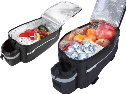 Universele thermotas voor montage op de achterdrager, ideaal voor dagelijks woon-werkverkeer en langere tochten. Het thermisch geïsoleerde hoofdvak bewaart veilig eten, drinken of kleding, terwijl kleinere vakken plek bieden voor sleutels, portemonnee of een fles water. Een reflecterende band rondom verhoogt de zichtbaarheid in schemer en donker.