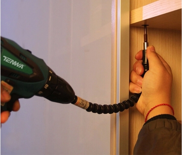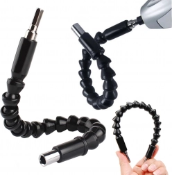De flexibele verlengadapter verandert uw schroevendraaier of boormachine in een tool die komt waar standaardaccessoires niet bij kunnen. De flexibele as buigt soepel en brengt de kracht van het gereedschap over, zelfs bij werken onder een hoek, zodat u moeiteloos een schroef aandraait om de hoek, langs een muur of onder een blad.