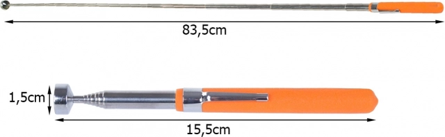 Praktische telescopische magneet voor het eenvoudig oppakken van metalen voorwerpen op moeilijk bereikbare plaatsen. Dankzij het bereik van 15,5–83,5 cm en een krachtige magneet vangt hij veilig schroeven, moeren en klein gereedschap. De anti-slip handgreep zorgt voor een comfortabele grip en de broekclip maakt het mogelijk het gereedschap altijd bij de hand te hebben.