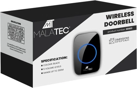 De draadloze deurbel Malatec is een modern apparaat dat betrouwbare meldingen van bezoekers biedt dankzij een bereik tot 300 meter. De elegante zwarte vormgeving is gemaakt van duurzaam ABS-plastic. Dankzij zijn waterdichte afwerking (IP44) kan hij ook regen en sneeuw weerstaan.