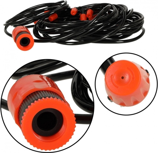 Je sluit de slang eenvoudig aan op een standaard tuinslang of rechtstreeks op de kraan. Debietregeling op de sproeikoppen laat je de nevelintensiteit aanpassen aan verschillende zones. Dankzij de mogelijkheid om de slang in te korten, pas je de afstand tussen sproeikoppen precies aan je behoeften aan en leid je water daarheen waar het het meest nodig is.