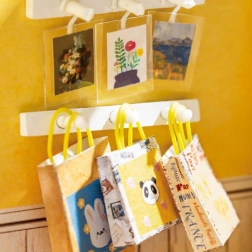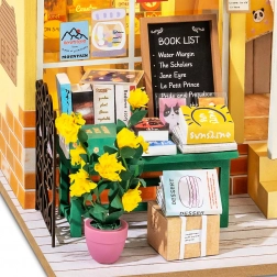 Plankjes met boekjes, een schattige beer, bloemen en accessoires – elk detail draagt bij aan de realistische en betoverende uitstraling van de mini-boekhandel.
