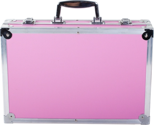 De koffer in roze kleur met metalen hoeken biedt stevige bescherming en gemakkelijke draagbaarheid dankzij het handvat.