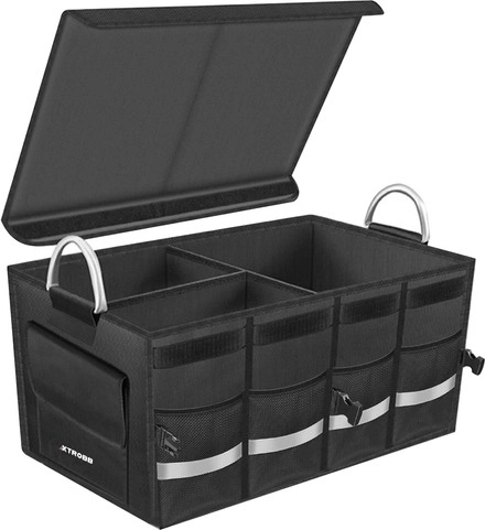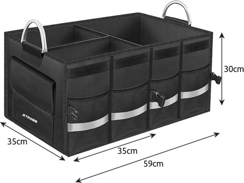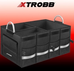 De grote, verstevigde XTROBB-kofferbakorganizer helpt de lading veilig op zijn plek te houden en alles binnen handbereik te hebben. De hoofdruimte kun je opdelen in maximaal drie secties, zodat gereedschap, autoverzorgingsmiddelen, kabels en kleine spullen overzichtelijk geordend blijven en tijdens het rijden niet verschuiven. Het afsluitbare klittenbanddeksel beschermt de inhoud tegen stof en zorgt voor een nette uitstraling van de kofferbak.