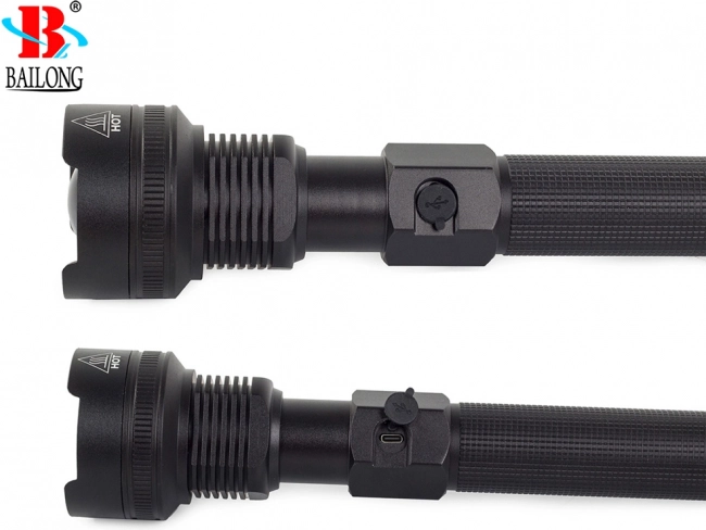 Krachtige tactische BAILONG-zaklamp met CREE XHP70-LED voor betrouwbare verlichting buiten en thuis. Biedt reikwijdte tot 1000 m, soepele zoom, 3 lichtstanden, een robuuste behuizing van luchtvaartaluminium met IPX5-bescherming, USB-opladen, voeding via 2× 26650 en een LED-indicator voor de laadstatus.