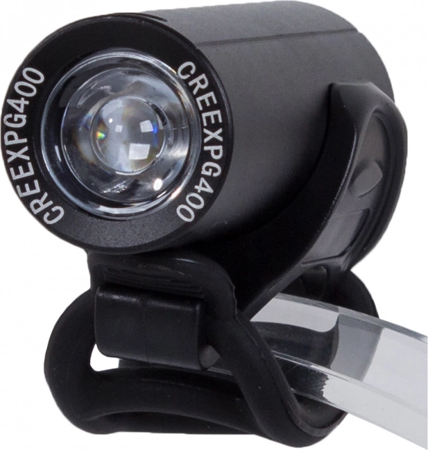 Veiliger rijden in het donker en in de regen dankzij de compacte voorlamp van luchtvaartaluminium met CREE XPG400 LED en een lichtstroom van 350 lm. Biedt 4 lichtstanden (100%, 75%, 50%, stroboscoop), waterbestendigheid IPX6, USB-opladen en een rubberen schakelaar. Eenvoudige montage op het stuur met de meegeleverde houder.