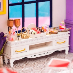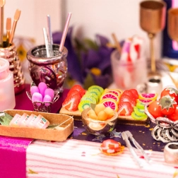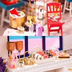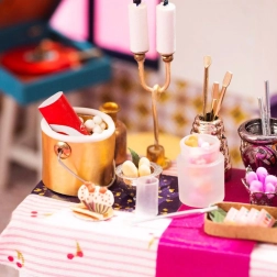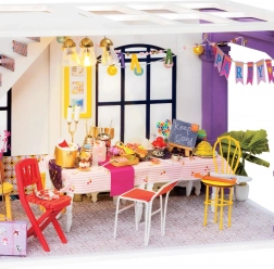 De miniatuur bevat gedetailleerde elementen zoals gekleurde stoelen, tafels en andere decoraties die een echte omgeving natuurgetrouw nabootsen.