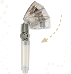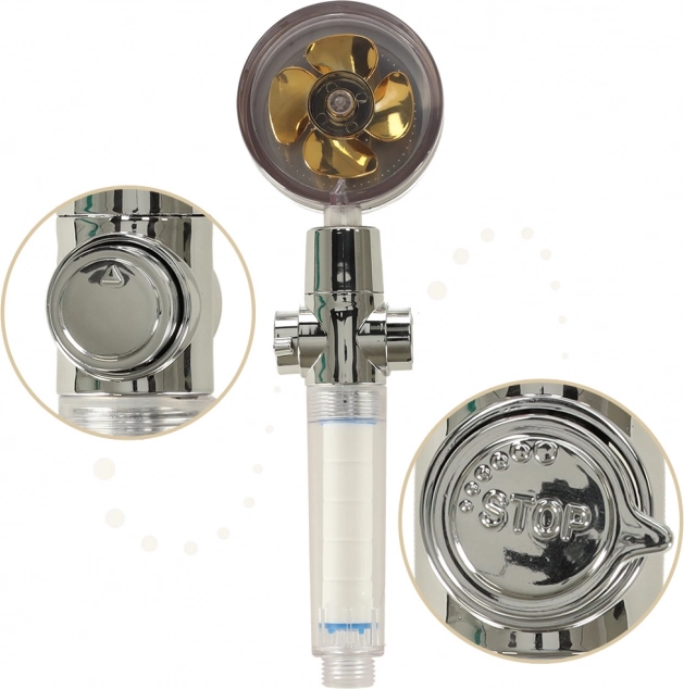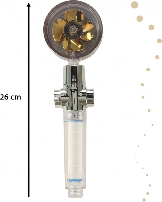 De douchekop met gouden turbine is de ideale oplossing voor elke moderne badkamer. Dankzij het grote aantal kleine openingen en de ingebouwde turbine verbetert het de waterdruk terwijl het waterverbruik en de kosten op de rekeningen worden bespaard. De interne filter helpt problemen met hard water te verwijderen, wat gunstig is voor zowel je haar als je huid.