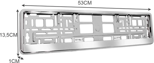 Inhoud verpakking: 2x kentekenplaathouder met afmetingen 53 x 13,5 x 1 cm en een gewicht van 381 g per stuk, totaal verpakkingsgewicht 538 g.