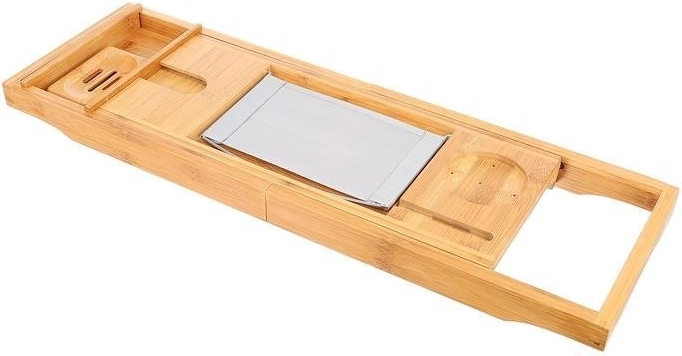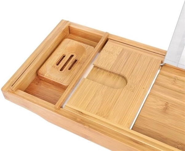 Geniet van ontspanning in bad met een stijlvolle bamboe plank met uittrekbare lengte, een boeken-/tabletstandaard met 3 kijkhoeken, ruimte voor een wijnglas, een zeepbakje, een afneembare inzet voor een handdoek en plek voor een kaars. Duurzaam bamboe is waterbestendig, droogt snel en is makkelijk schoon te maken – ideaal voor jouw thuis-wellness.