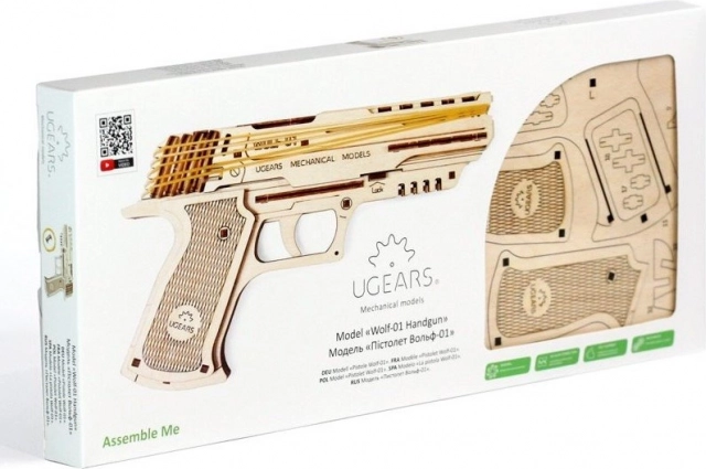 Het UGEARS Wolf-01 model is een gedetailleerde houten replica van een pistool met elastiekaandrijving, die je zonder lijm in elkaar zet met behulp van precies uitgesneden onderdelen. Na de montage krijg je een functionerend mechanisch model dat betrouwbaar elastiekjes afschiet en je in de praktijk laat zien hoe tandwielen, het trekkermechanisme en materiaalflexibiliteit samenwerken.