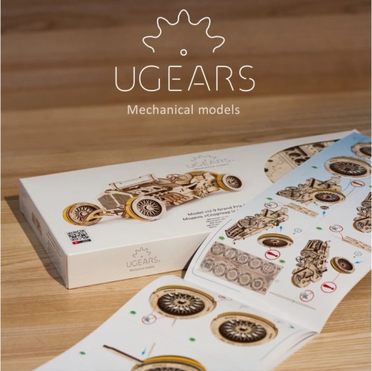 Ontdek de charme van de eerste racespecials met het gedetailleerde model UGEARS U9 Grand Prix. Dit houten mechanische model met opwindmechanisme biedt een functionele versnellingsbak (stationair en achteruit), stuurbaarheid, een geveerde vooras en rubberen banden voor betere grip. Dankzij de zichtbare V8-motor met bewegende zuigers en koelingsventilator is het een fascinerend schouwspel, zowel rijdend als op de plank.