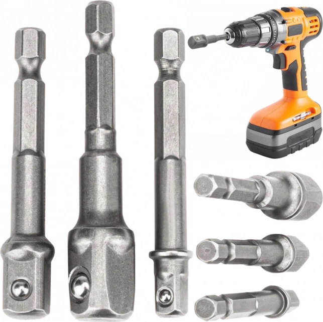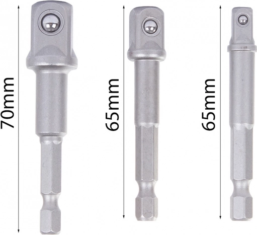 De set bevat drie reducties gemaakt van duurzaam staal, wat hun lange levensduur garandeert. De reducties maken het gebruik van schroevendraaiers met stopkontaktsleutels van verschillende afmetingen mogelijk.