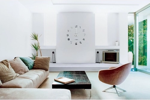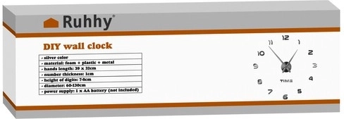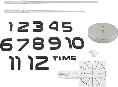 Dankzij het stille mechanisme met vloeiende beweging stoort de klok niet tijdens werk of ontspanning. Zelfklevende cijfers van EVA-schuim hechten stevig op de meeste gladde oppervlakken en een speciale papieren sjabloon helpt bij het nauwkeurig uitzetten van de cirkel. Lange, elegante wijzers in zilverkleur benadrukken het strakke design.