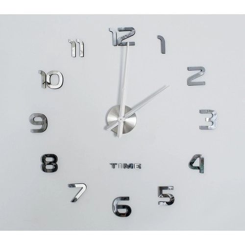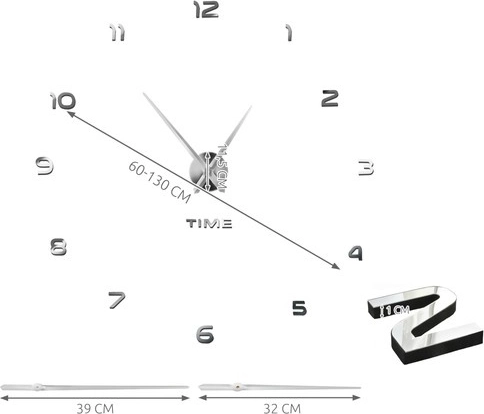 Moderne wandklok voor zelfmontage met verstelbare diameter van 60–130 cm die elk interieur verfraait. Glanzende zilveren 3D-cijfers met spiegeleffect zorgen voor een elegante uitstraling, terwijl de stille, vloeiende beweging zonder tikken rust biedt in zowel de woonkamer als de slaapkamer. Dankzij de meegeleverde sjabloon en zelfklevende cijfers is de montage snel en eenvoudig. Werkt op 1× AA-batterij (niet inbegrepen).