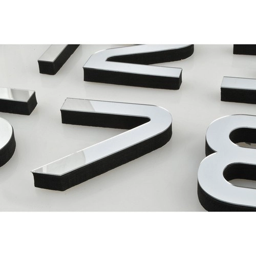 Glanzende zilveren afdekkingen op de cijfers creëren een modern 3D-effect dat op elke muur opvalt en de ruimte optisch oplicht.