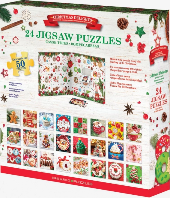 Deze adventskalender van EUROGRAPHICS brengt elke decemberdag plezier. In 24 vakjes vind je 24 verschillende puzzels, elk met 50 stukjes en een prachtig kerstmotief. De afbeeldingen zijn vierkant en meten na het leggen ca. 12,5 × 12,5 cm. In elk vakje zit ook een voorbeeld voor gemakkelijker leggen en op de achterkant van de verpakking vind je een overzicht van alle motieven.