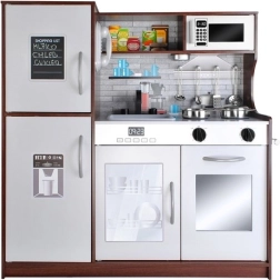 De stijlvolle houten keuken XL biedt kinderen een realistisch kookspel dankzij LED-achtergrondverlichting, klikgeluiden van draaiknoppen en een uitgebreide set accessoires. De stevige houten constructie, moderne uitstraling en functionele details zoals een oven, magnetron, fornuis en uitneembare spoelbak stimuleren creativiteit en de ontwikkeling van de fijne motoriek.