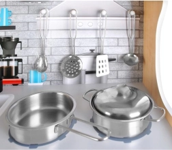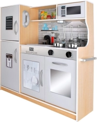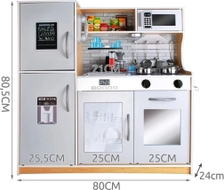 De keuken is gemaakt van hoogwaardig hout, waardoor hij stabiel, duurzaam en veilig is. Het pakket bevat rijk metalen accessoires – pan, koekenpan, deksel en 4 keukentools – en een uitneembare gootsteen voor eenvoudig “afwassen”. Het neutrale ontwerp en de kleuren zijn geschikt voor zowel meisjes als jongens.