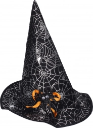 Mooie zwarte hoed met een spin en zilveren spinnenwebben is het ideale accessoire voor alle kleine tovenaars.