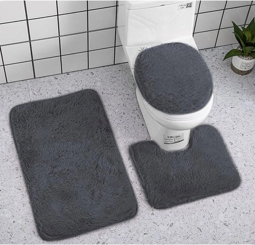 Stijlvolle 3-in-1 badkamerset in het grijs met zacht comfort, hoge absorptie en een veilig antisliponderzijde. Bevat een rechthoekige badmat, een mat met uitsparing voor het toilet en een hoes voor de toiletbril. Eenvoudig onderhoud – machinewasbaar op 30 °C.