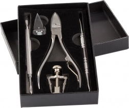 De ergonomische nagelkniptang biedt een zekere grip en een schone knip, de corrector voor ingegroeide nagels helpt de nagelplaat voorzichtig op te lichten en te richten en de elevator maakt het mogelijk om de nagel zacht van de huid los te maken. De vijl en de nagelriemduwer ronden de verzorging af tot een glad en verzorgd uiterlijk. Alles is opgeborgen in een compacte, elegante etui voor gemakkelijk meenemen.
