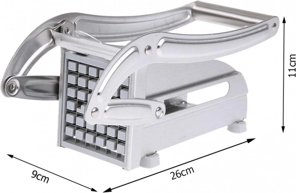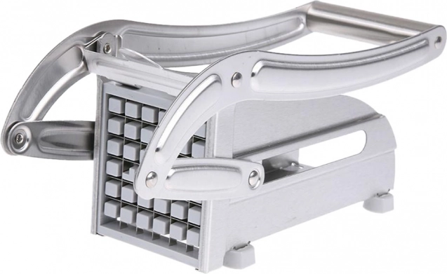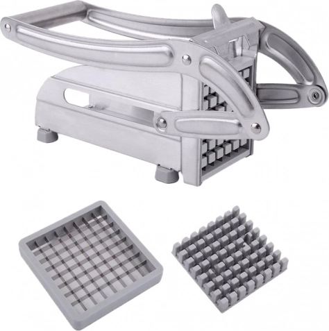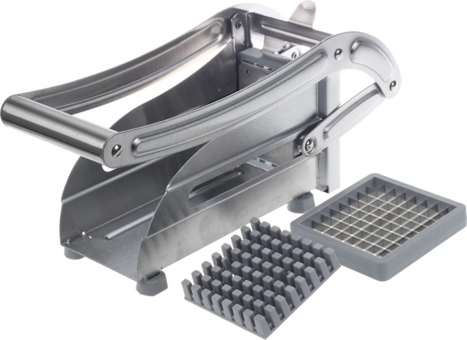 Met deze snijder verander je aardappelen in een oogwenk in gelijkmatige frieten. Plaats de aardappel en druk stevig aan – de scherpe stalen messen snijden hem moeiteloos in gelijke stukken. De meegeleverde twee verwisselbare messen/roosters laten je kiezen tussen dunne of dikkere friet naar smaak.