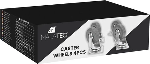 De set industriële zwenkwielen van het merk Malatec combineert praktische functionaliteit met een hoge draagkracht tot 220 kg. De wielen zijn gemaakt van duurzaam ijzer met een rubberen oppervlak, dat voor stille en veilige beweging zorgt. Twee van deze wielen zijn voorzien van geïntegreerde remmen die veilige vastzetting van de beweging op de plaats mogelijk maken.