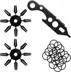 De set bevat 12 pijlen, 100 vervangende punten, beschermende doppen en een multifunctioneel gereedschap.
