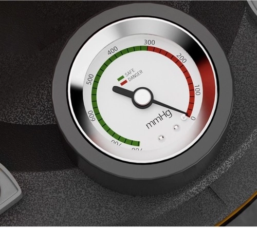 - De manometer maakt het mogelijk de druk te bewaken tot 760 mmHg, wat maximale veiligheid tijdens het gebruik waarborgt.