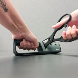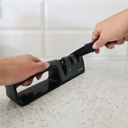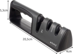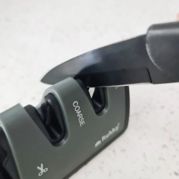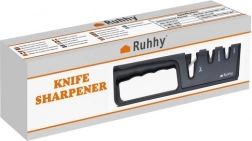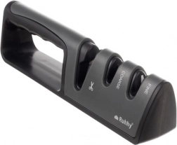 De praktische 3-fasen RUHHY-slijper herstelt de snede van je keukenmessen en scharen in slechts enkele halen. De eerste sleuf is voor scharen, de tweede voor grof voorslijpen van beschadigde snedes en de derde voor fijn naslijpen en polijsten. De stabiele constructie met antislipvoetjes en ergonomische handgreep zorgt voor comfortabel en veilig gebruik.