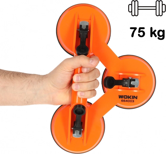 Professionele drievoudige vacuümzuignap van WOKIN met een draagvermogen van 75 kg, voor veilig tillen, verplaatsen en positioneren van glas, glazuur en grootformaat tegels. Drie zuigpunten met een diameter van 11,5 cm zorgen voor een stabiele grip zonder krassen op het oppervlak, terwijl de ergonomische handgreep nauwkeurige bediening en meer werkcomfort biedt.