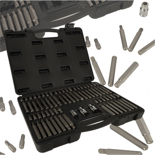 Met deze complete bitset krijgt u alles wat u nodig heeft voor het vast- en losdraaien van diverse soorten verbindingen in de auto-, machine- en thuissfeer. Bits van chroom-vanadiumstaal (CrV) bieden hoge duurzaamheid, een nauwkeurige passing en een betrouwbare krachtoverbrenging. In de set vindt u korte en lange bits in een brede reeks maten en ook adapters 1/2" en 3/8" voor maximale compatibiliteit met gereedschap.