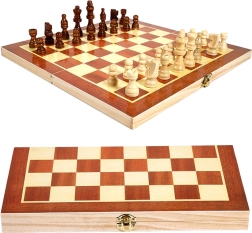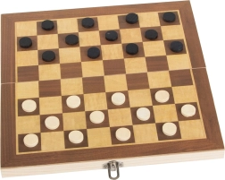 Speel het geliefde damspel op het dubbelzijdige houten bord, dat je na het spel eenvoudig opvouwt en veilig afsluit.
