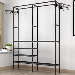 Organiseer je huis slim en stijlvol. De dubbele kledingstandaard RUHHY combineert een open ontwerp met hoge functionaliteit – ideaal voor slaapkamer, inloopkast, hal en huurwoningen. Dankzij 6 planken van duurzaam materiaal, een stevige kledingroede en 8 haken heb je ruimte voor jassen, overhemden, schoenen, dozen en handtassen.
